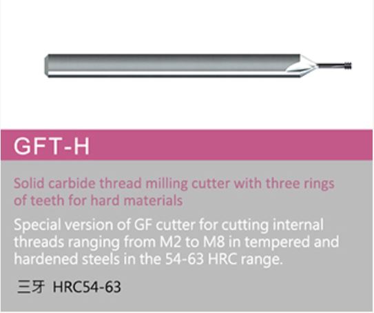 Special version of GF cutter for cutting internal threads ranging from M2 to M8 in tempered and hardened steels in the 54-63 HRC range.